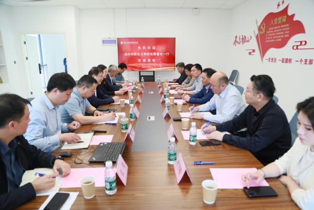 4月16日下午,扬州市职业大学党委副书记、校长周春光,党委委员、副校长吴书安一行7人来校调研交流,华体会官方版网站登录入口党委副书记、校长何学军,党委常委、副校长魏萍在双创大楼三楼会议室接待了来宾,相关职能部门负责人陪同接待。