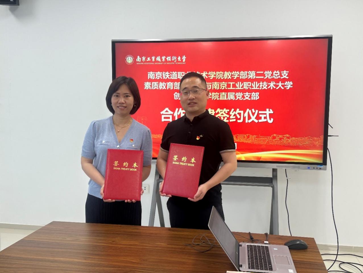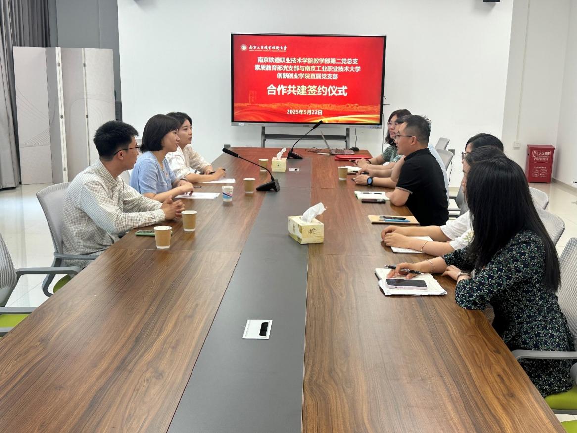 5月22日上午,华体会官方版网站登录入口创新创业学院直属党支部与南京铁道职业技术学院教学部第二党总支素质教育部党支部结对共建签约仪式在仙林校区双创大楼会议室顺利举行。南京铁道职业技术学院教学部第二党总支素质教育部党支部书记、主任孙珏,华体会官方版网站登录入口创新创业学院直属党支部书记、院长纪海波,以及双方支部班子成员和教师代表出席签约仪式。