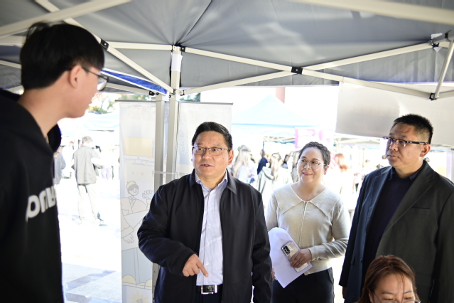 校党委副书记浦黄忠,艺术设计学院党委副书记、院长孔伟,党委副书记、副院长高原,副院长任小飞等领导亲临现场,与参会企业代表深入交流,详细了解岗位设置及人才需求情况。浦黄忠对前来招聘的用人单位表示欢迎和感谢,并希望学院继续深化与用人单位的合作,拓宽就业渠道,推动人才培养与产业需求深度对接,积极探索产学研融合发展新路径。孔伟向企业介绍了学院学科建设、人才培养特色并详细了解了企业行业发展趋势以及对学校人才培养的反馈建议。专业教师与毕业班辅导员现场为同学们提供就业指导服务,答疑解惑,坚定求职信心。