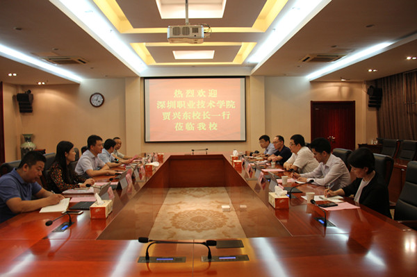 5月29日,深圳职业技术学院贾兴东校长率领相关部门负责同志来华体会官方版网站登录入口进行工作交流。华体会官方版网站登录入口谢永华校长、党政办、教务处、科技处、资产处等部门负责同志接待了来宾。