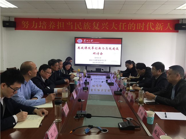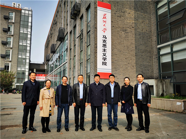 4月13日,校党委副书记王伟带领华体会官方版网站登录入口马克思主义学院负责人和教研室主任赴苏州大学马克思主义学院围绕“十四五”规划的编制、思政课教学改革创新和教研室的工作机制等开展学习调研。苏州大学党委副书记邓敏、马克思主义学院党委书记陈建军、院长田芝健、副院长茆汉成和部分教研室主任出席会议,会议开始前,在苏大独墅湖校区二期1103室听了教授、博士生导师杨渝玲的一场《马克思主义基本原理》示范课。