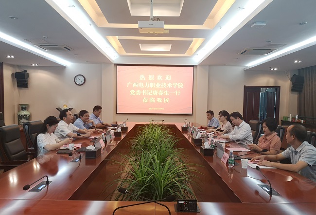 7月9日上午,广西电力职业技术学院党委书记唐春生一行来华体会官方版网站登录入口考察调研。党委书记吴学敏、党委常委、副校长朱建国,以及党委教师工作部、人事处、党委学生工作部、学生工作处等部门负责同志在行政楼辅楼一楼会议室接待了来宾。