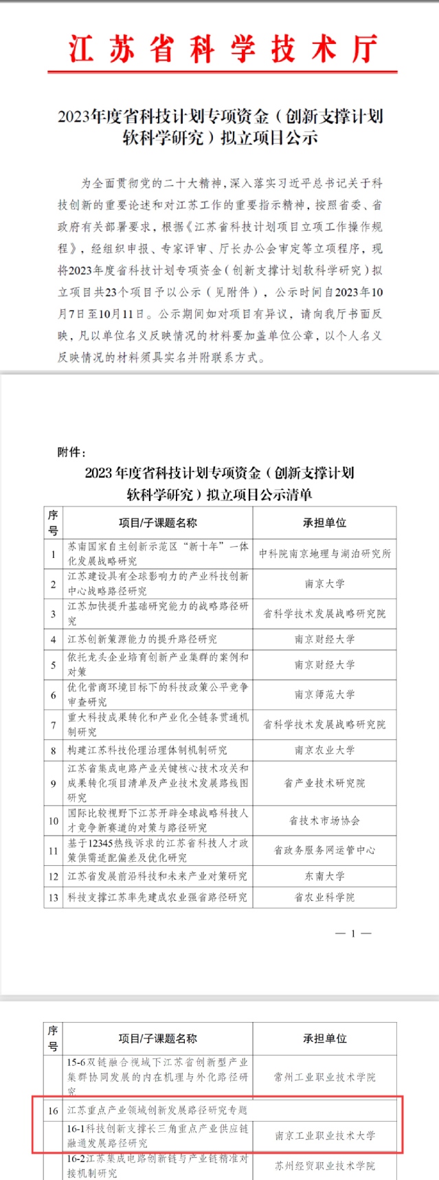近日,江苏省科学技术厅公布了2023年度省科技计划专项资金(创新支撑计划软科学研究)拟立项目公示清单,商务贸易学院现代物流管理系王桂花教授主持申报的《科技创新支撑长三角重点产业供应链融通发展路径研究》成功获批立项。