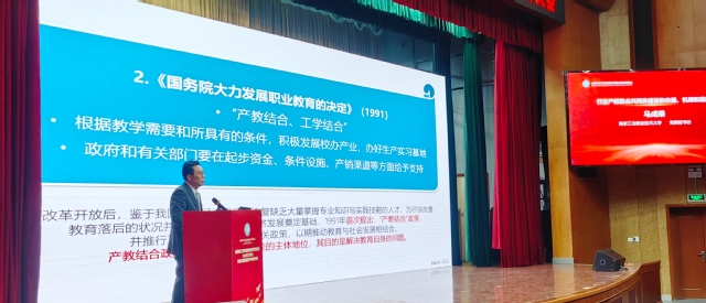 报告中马成荣对产教融合共同体建设按照政策演进、理论模型和实践进路三个方面,分别就国家宏观政策的演进路程,政校企三方转变和作用的发挥,共同体建设的要义、理念、模式、途径以及策略等进行了解读和分析,他指出行业产教融合共同体是“政校企”三重螺旋模型在行业产业中应用而产生的新的创生体和组织系统,这一共同体的建设理念是努力构建信息、机构、利益、价值和改革的共同体,其核心思想是将具有不同价值体系和功能的大学(知识生产)、企业(财富创造)、政府(规范控制)融为一体,并在发展区域社会经济上统一起来,形成知识领域、行业领域和产业领域的三力合一,从而为区域经济创新和社会发展奠定坚实基础,同时促进三个主体的共生共长。马成荣指出在构建共同体的过程中需要重点研究的问题有以下两点:一是“两化融合”与新业态、新职业、新专业及传统专业的转型升级;二是介于工程技术活动和生产技术活动“职业带”居间人才的培养定位。在会上,马成荣也提出了打开各参与主体的边界、创生多元合作的空间和打造知识交换的平台等三点建设策略。