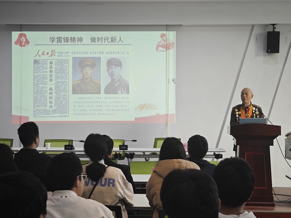 赵明才从与雷锋的相识和约定、身体力行践行雷锋精神的奋斗人生、新时代青年如何践行雷锋精神三个方面展开。赵明才首先介绍了雷锋同志的不幸身世、性格品格与爱好,以其亲身经历的真实故事展现了雷锋热爱文艺、尊老爱幼、爱岗敬业、无私奉献的鲜活形象,并着重为同学们剖析了“钉子精神”。同时,他结合自身的人生经历和青年大学生畅谈新时代如何践行和传承雷锋精神。